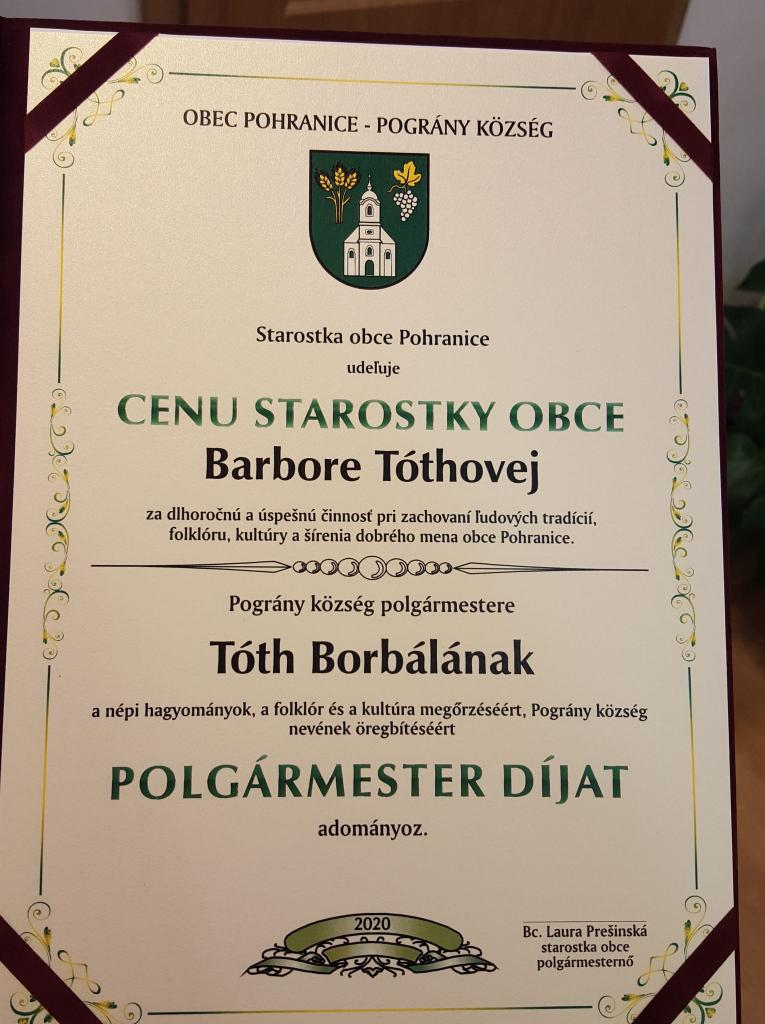 SK: V rámci podujatia Stretnutie Generácií bola odovzdaná prvýkrát Cena starostky obce. Ocenenou bola Barbora Tóthová.