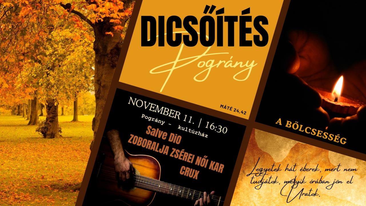 Nagy szeretettel hívunk mindenkit 2023. november 11-én, szombaton délután 16:30-tól egy zenés dicsőítésre a pogrányi kultúrházba. A dicsőítés keretében fellép a Salve DiO, a Zoboralja Zsérei Női Kar és a CRUX zenekar. A belépés ingyenes, további információk a Dicsőítő Felvidék Facebook oldalán találhatóak.