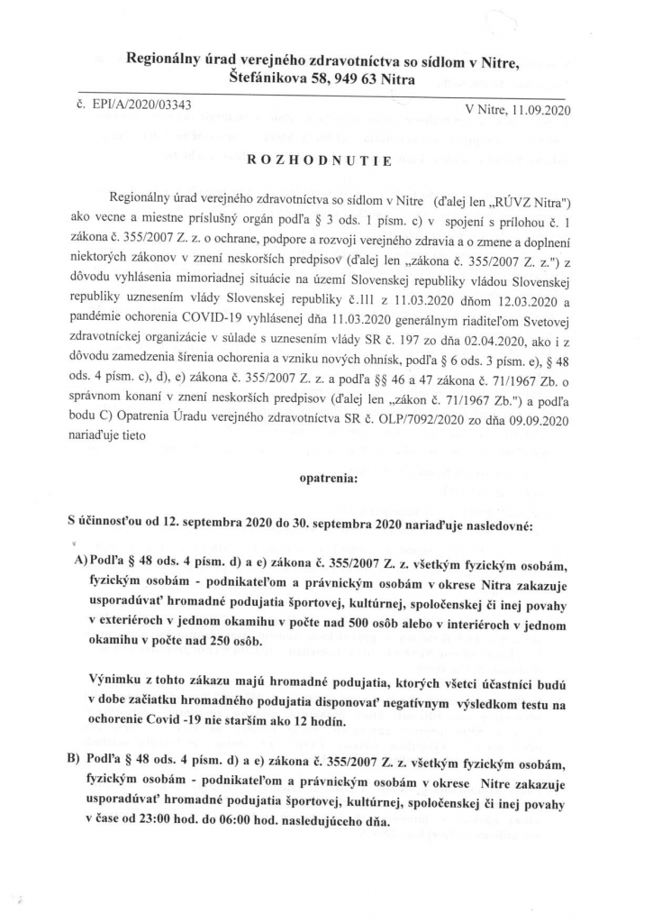 ☝️ Od soboty 12. septembra platí zákaz usporadúvať hromadné športové, kultúrne spoločenské podujatia od 23. do 6. hodiny nasledujúceho dňa.