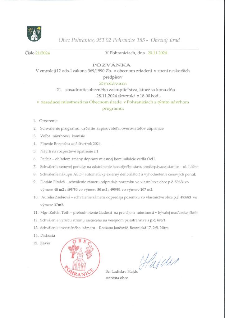Pozývame Vás na 21 zasadnutie obecného zastupiteľstva, ktoré sa koná dňa 28.11.2024 o 18.00 hod., v zasadacej miestnosti obecného úradu v Pohraniciach. Srdečne Vás pozývame.