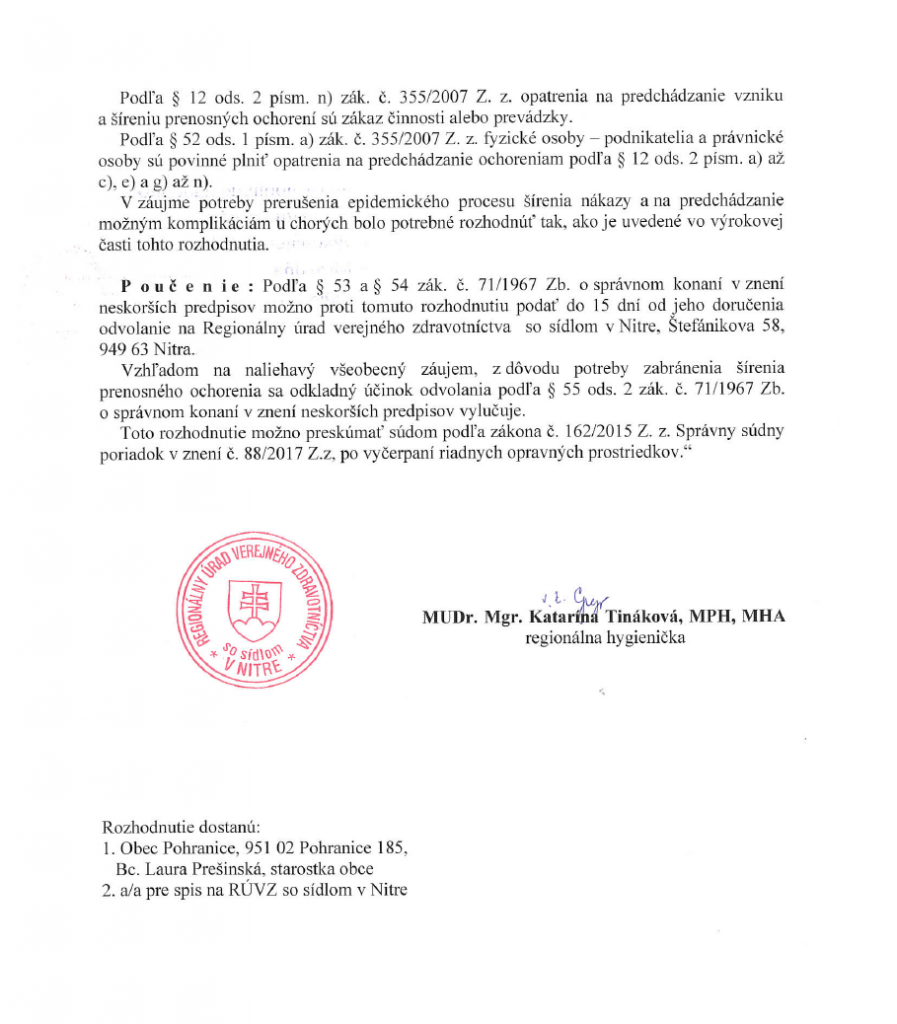 Rozhodnutie RÚVZ Nitra o zákaze uskutočňovania výchovno-vzdelávacieho procesu v MŠ, Pohranice 444 od 22.02.2019 do 01.03.2019.