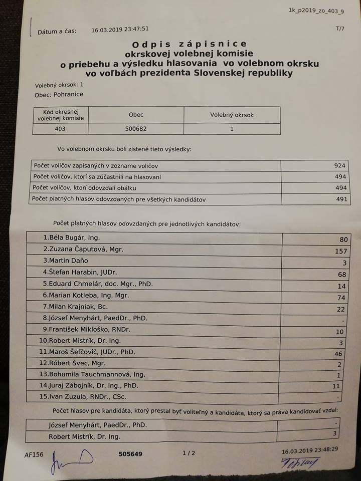 SK: Výsledky hlasovania vo volebnom okrsku Pohranice vo voľbách prezidenta Slovenskej republiky.