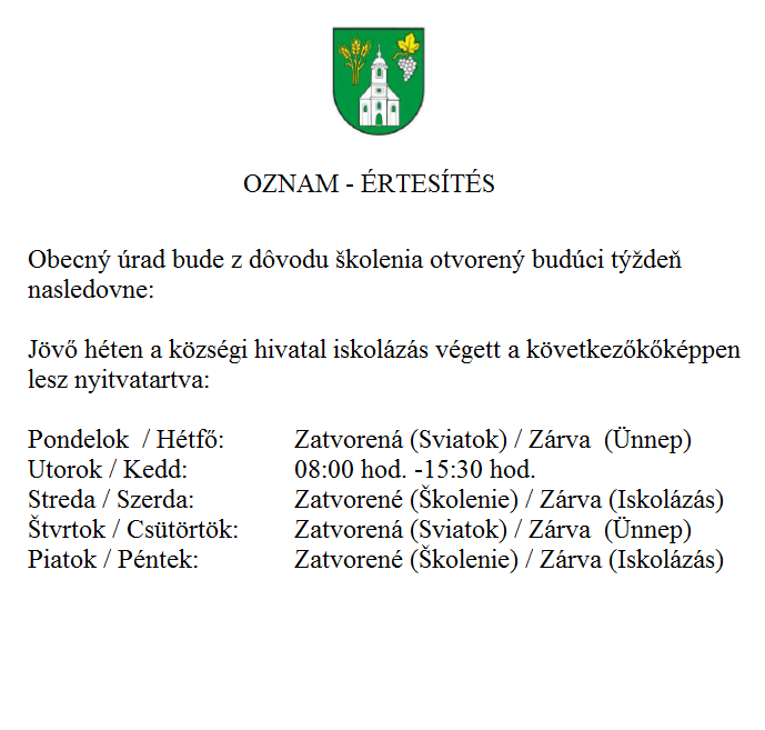 Pondelok / Hétfő: 08:00 – 12:00 13:00 – 15:00