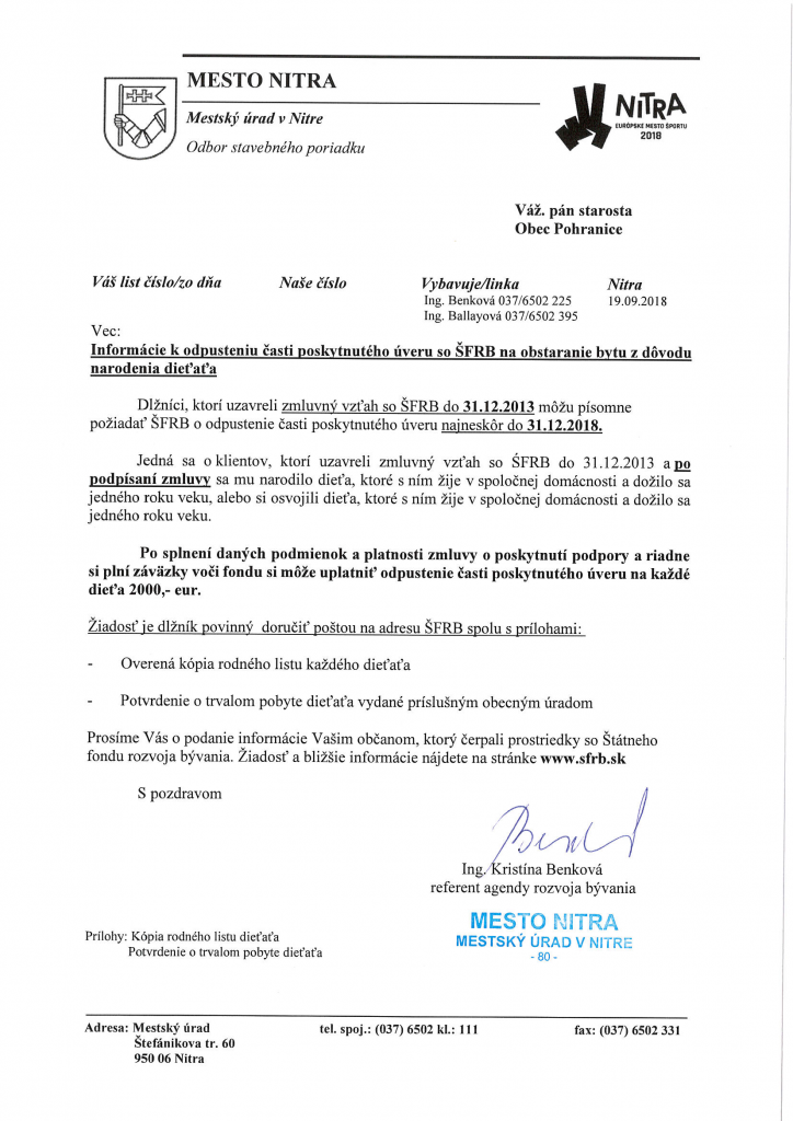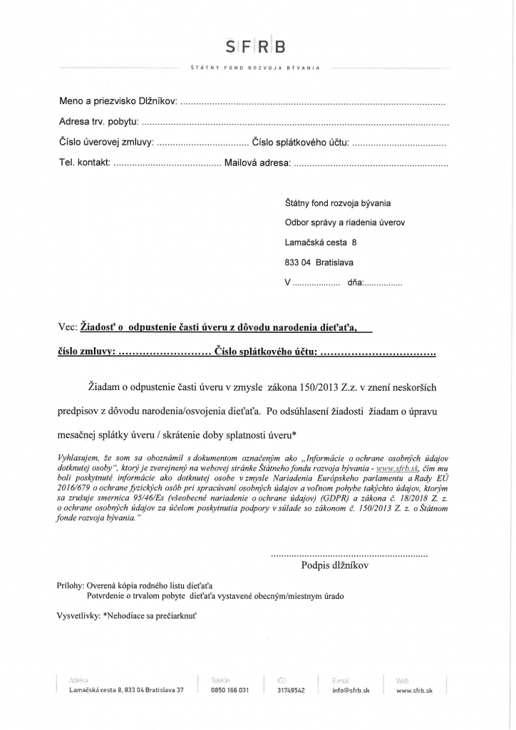 SK:Informácie k odpusteniu časti poskytnutého úveru so ŠFRB na obstaranie bytu z dôvodu narodenia dieťaťa