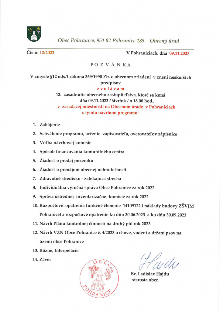 Pozývame Vás na 12. zasadnutie obecného zastupiteľstva, ktoré sa koná 09.11.2023 o 18.00 hod.,v zasadacej miestnosti na Obecnom úrade v Pohraniciach.