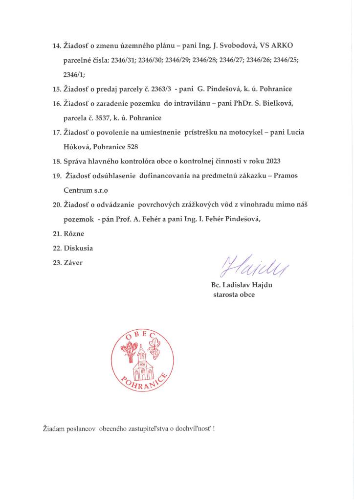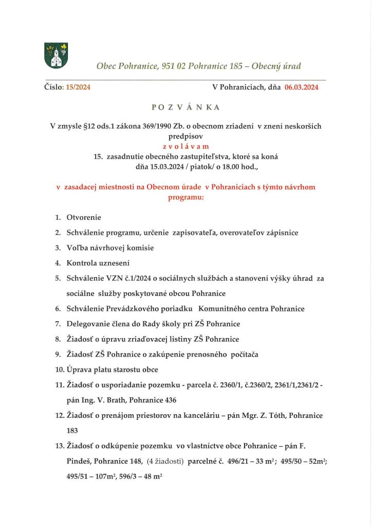 Pozývame Vás na 15. zasadnutie Obecného zastupiteľstva, ktoré sa koná 15.03.2024 o 18:00 hod., v zasadacej miestnosti obecného úradu v Pohraniciach.
