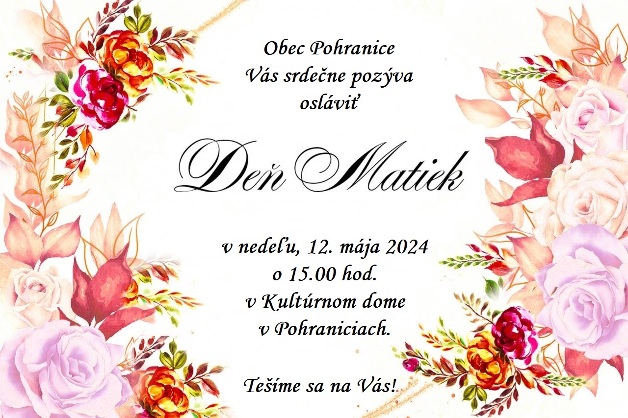 Obec Pohranice Vás srdečne pozýva osláviť Deň matiek, v nedeľu, 12. mája 2024, o 15.00 hod. v Kultúrnom dome v Pohraniciach.