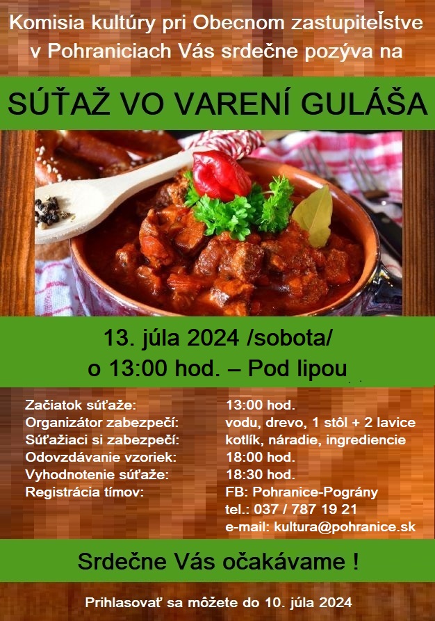 Pozývame Vás na súťaž vo varení guláša, ktorá sa bude konať dňa 13.7.2024 o 13:00 hod. Pod lipou v Pohraniciach.