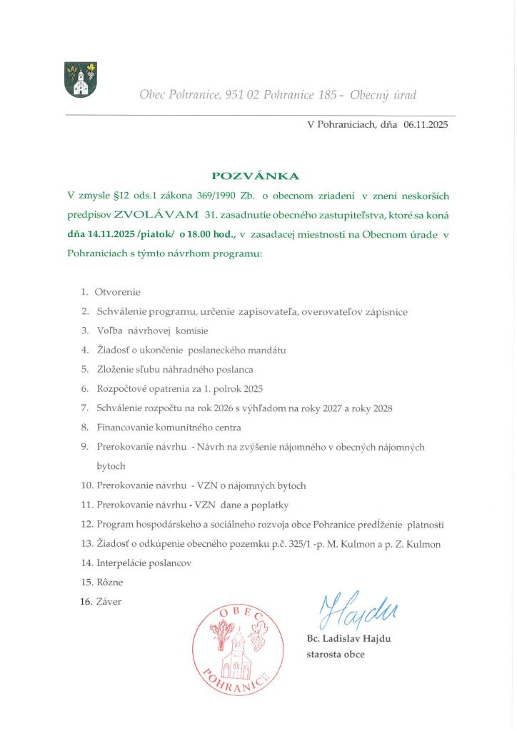 Pozývame Vás na 31.prvé zasadnutie obecného zastupiteľstva, ktoré sa koná 14.11.2025 piatok o 18:00 hod. v zasadacej miestnosti ObÚ v Pohraniciach.