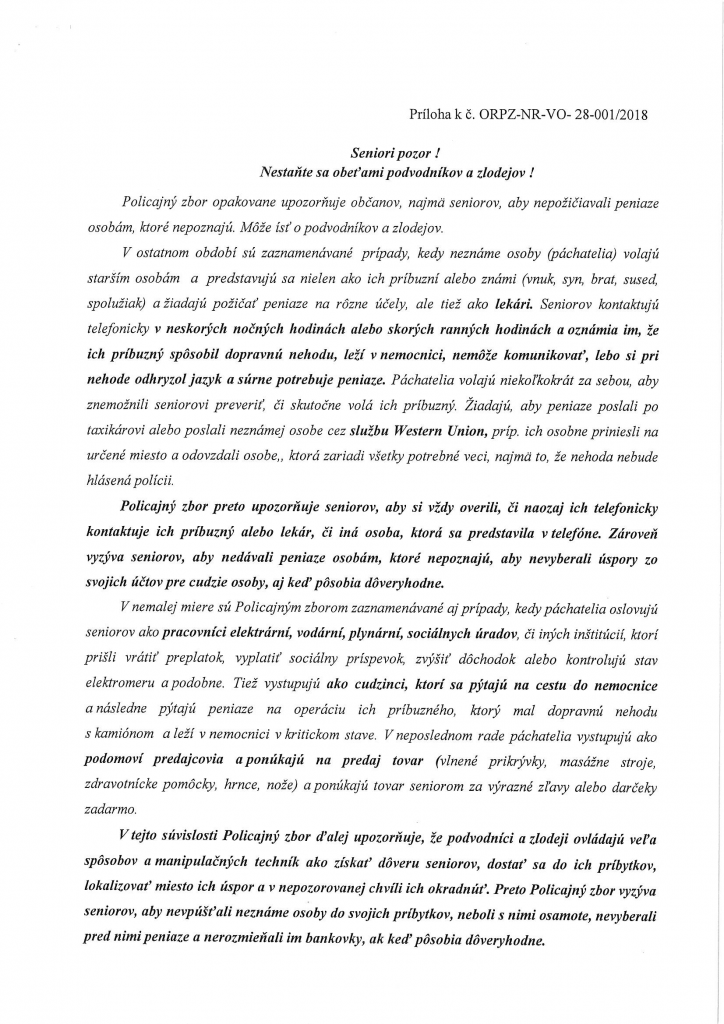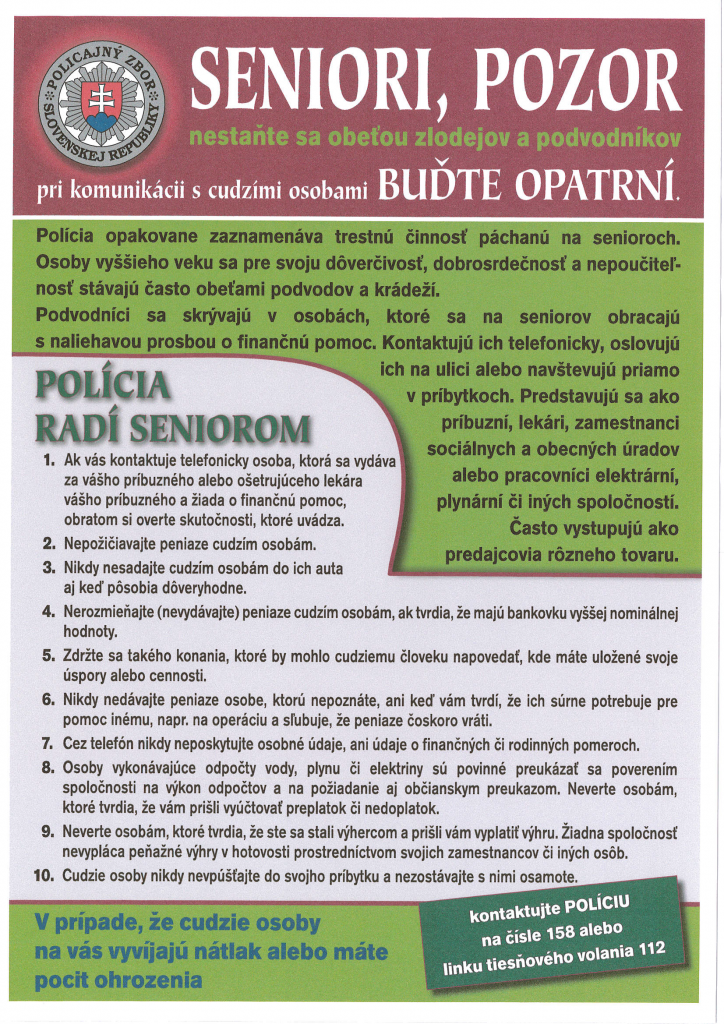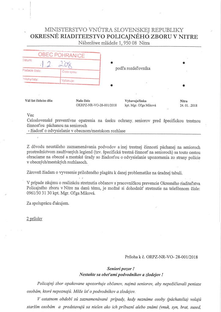 SK: Dňa 1. februára 2018 nám prišiel list od Ministerstva vnútra SR ohľadom celoslovenského preventívneho opatrenia na úseku ochrany seniorov.Bližšie informácie získate z naskenovaných obrázkov.