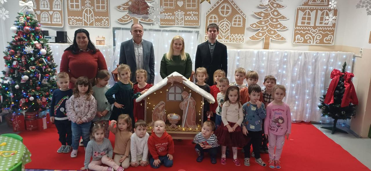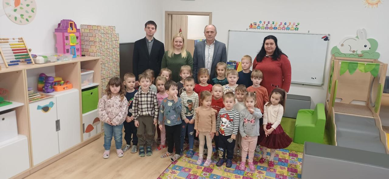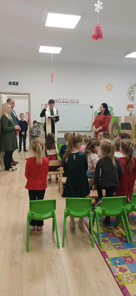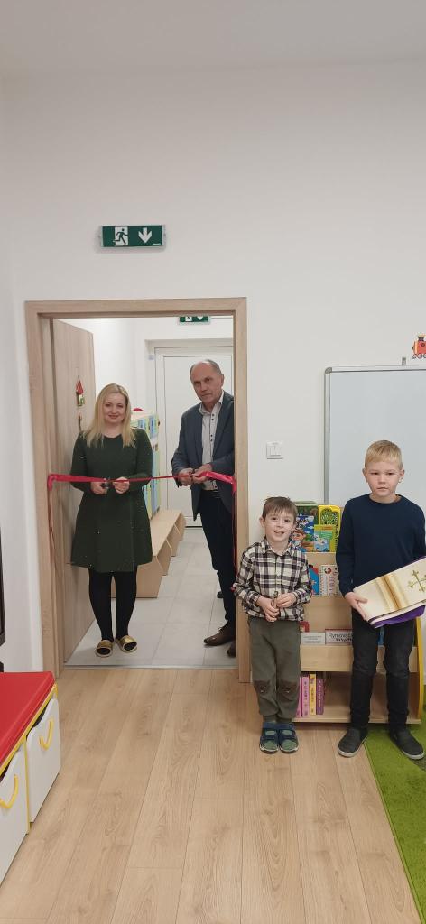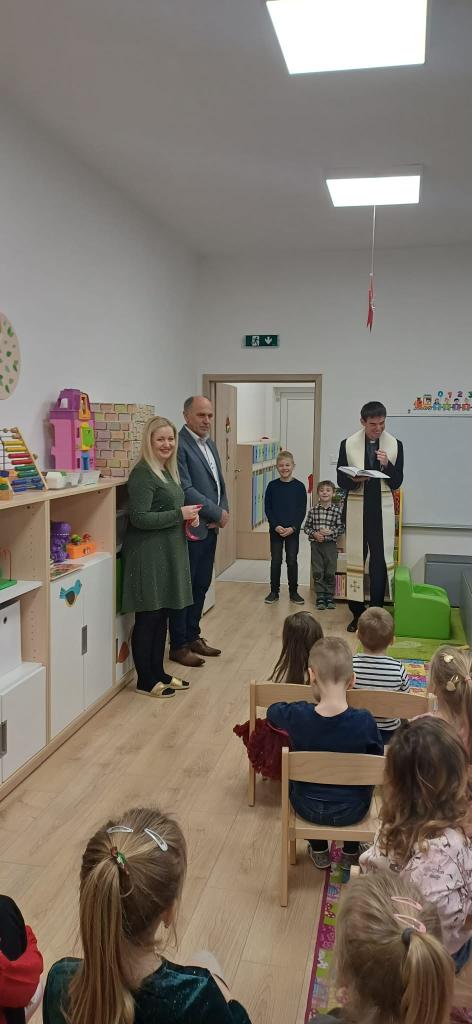 Slávnostné otvorenie a vysvätenie rozšírenia materskej školy. Ďakujeme pánovi farárovi za vysvätenie.