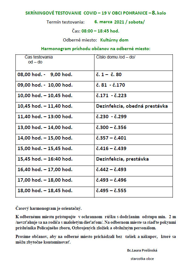 SK: Harmonogram testovania bude podľa súpisných čísel /viď pri ozname/.