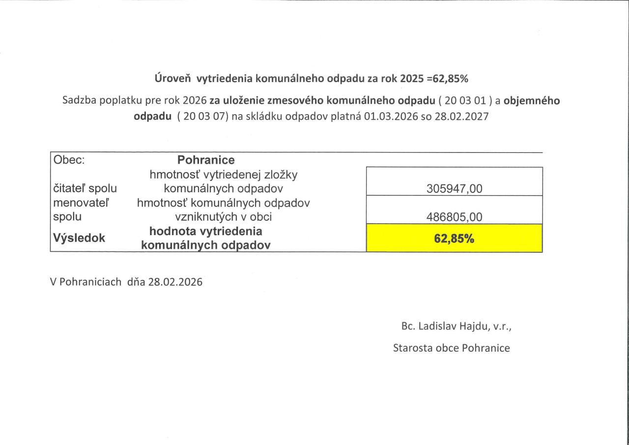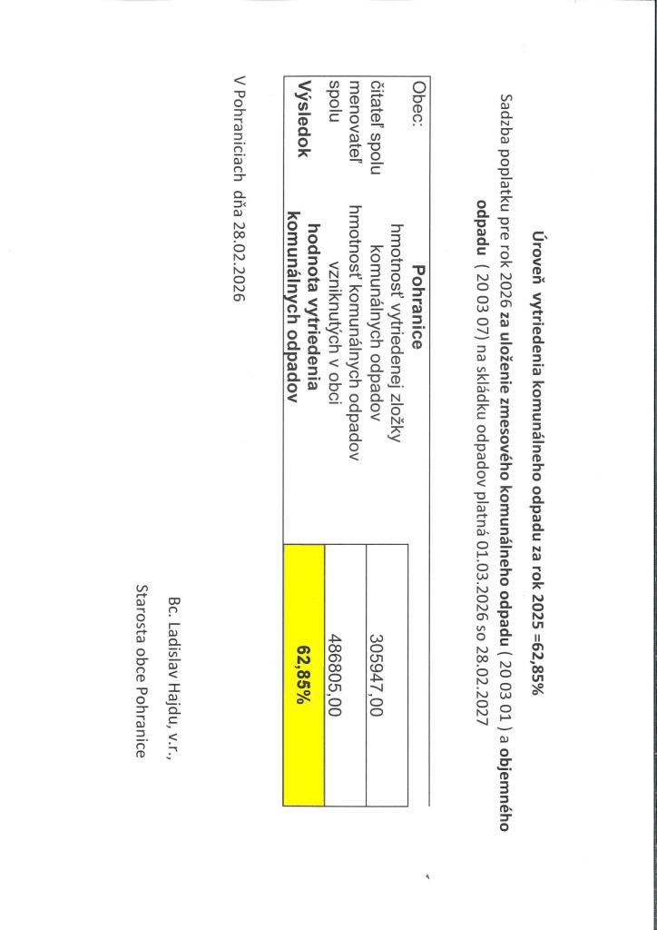 Sadzba poplatku pre rok 2026 za uloženie zmesového komunálneho odpadu ( 20 03 01 ) a objemného odpadu ( 20 03 07) na skládku odpadov platná 01.03.2026 so 28.02.2027