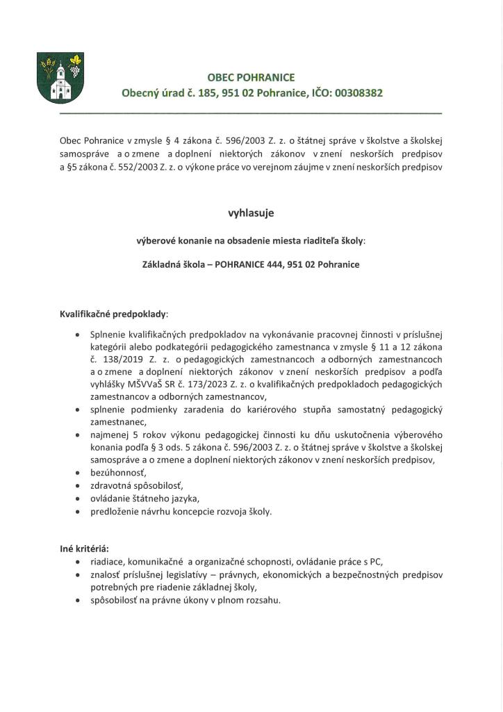 Výberové konanie na obsadenie miesta riaditeľa Základnej školy v Pohraniciach