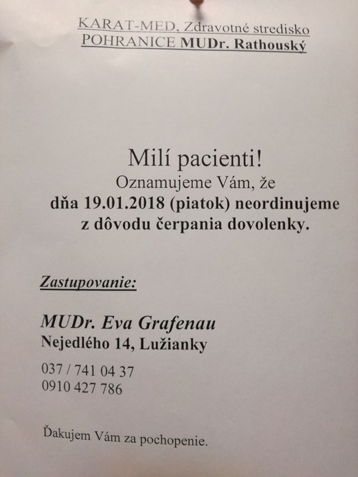 2018.01.19.-én a felnőtt-orvosi rendelő be lesz zárva. Helyettesíteni Lužianky-n fog MUDr. Eva Grafenau.