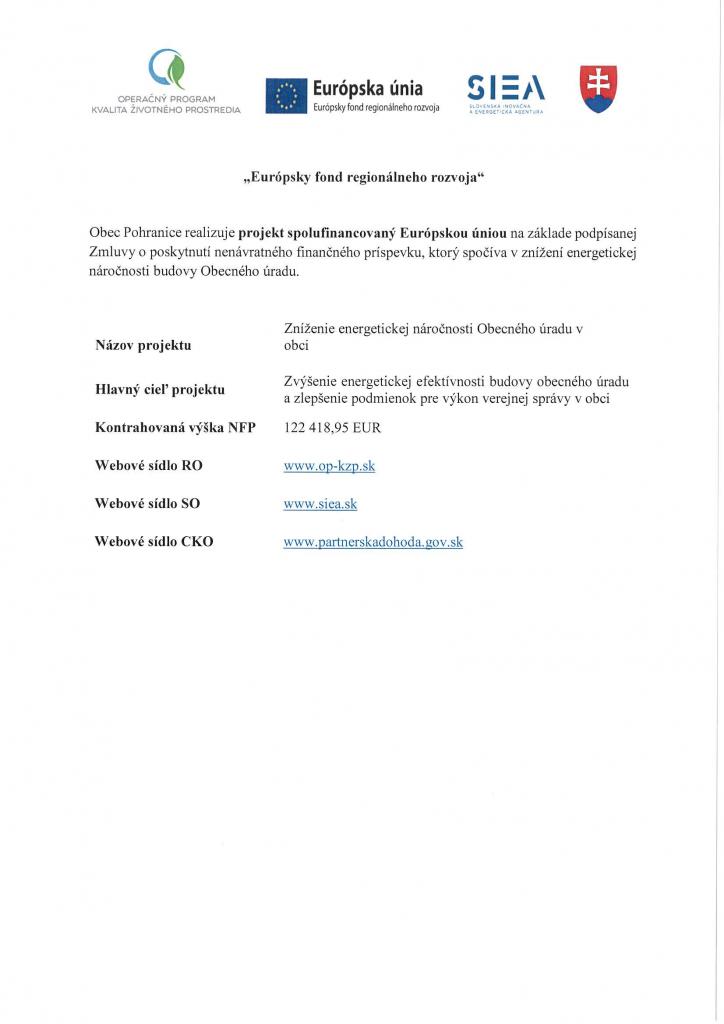 Obec Pohranice realizuje projekt spolufinancovaný Európskou úniou na základe podpísanej Zmluvy o poskytnutí nenávratného finančného príspevku, ktorý spočíva v znížení energetickej náročnosti budovy Obecného úradu.