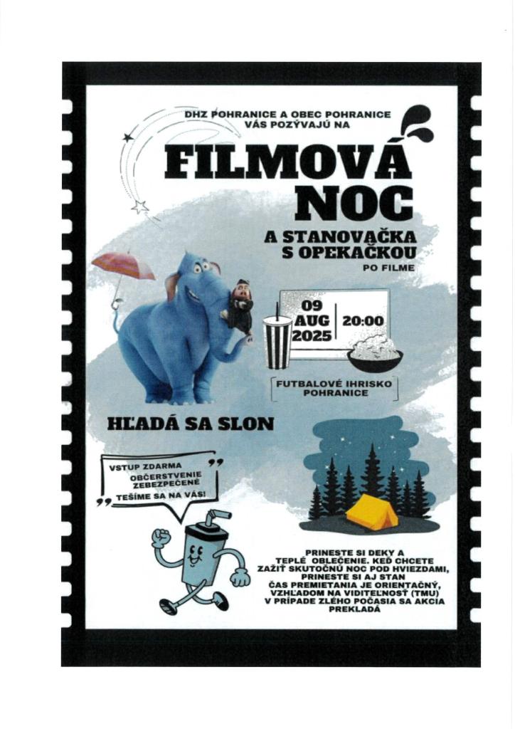 Obec Pohranice a Dobrovoľný hasičský zbor Pohranice, Vás pozývajú na Filmovú noc, počas ktorej si pozrieme animovaný film " Hľadá sa Slon".