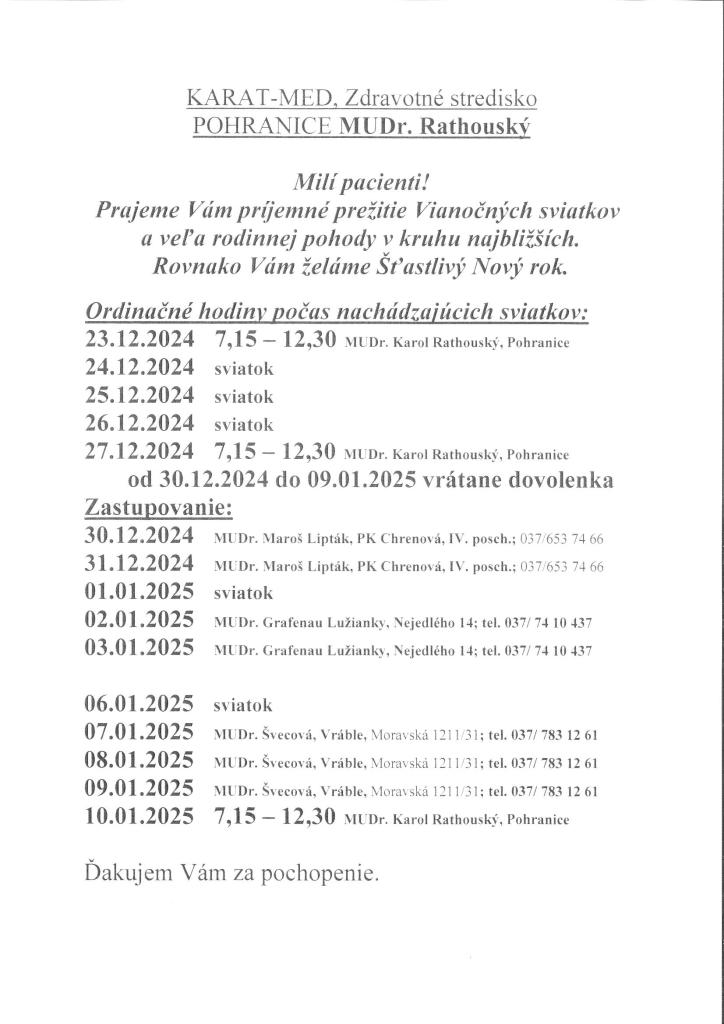 Ordinačné hodiny počas sviatkov Mudr. Karol Rathouský
