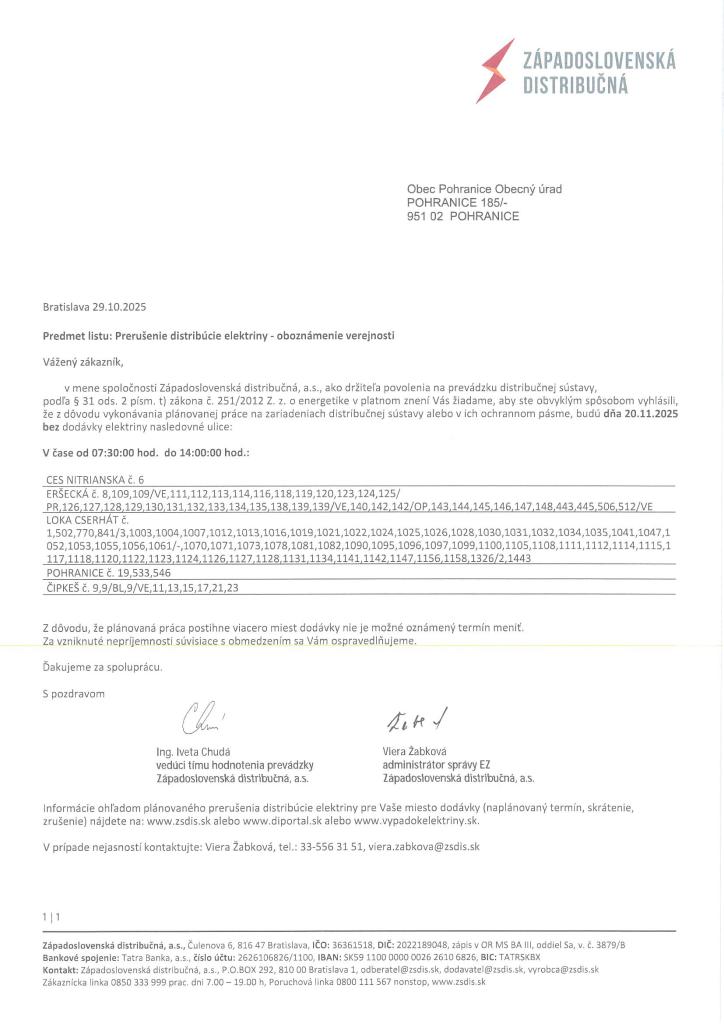 Prerušenie distribúcie elektriny 20.11.2025 - Villamosenergia-elosztási szünet 2025.11.20.
