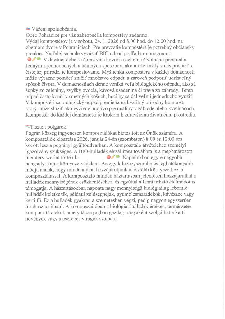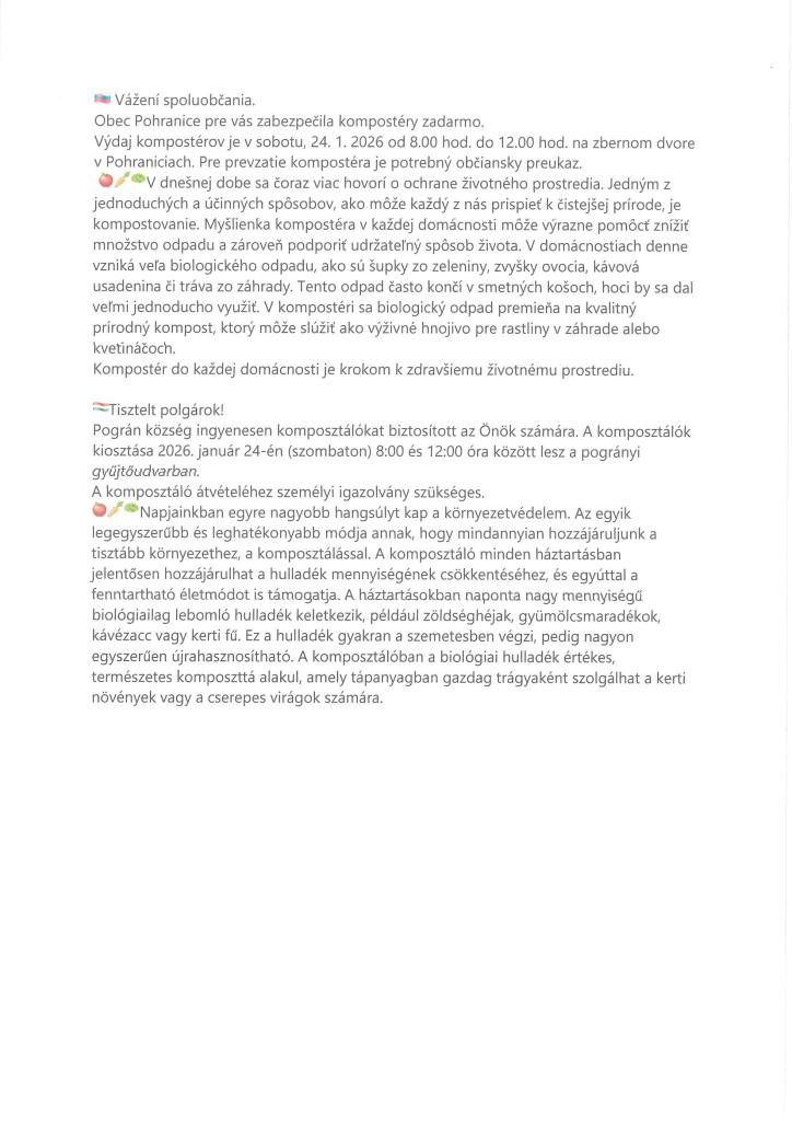 Obec Pohranice pre vás zabezpečila kompostéry zadarmo. Pográny község ingyenesen komposztálok biztosított az Önök számára.