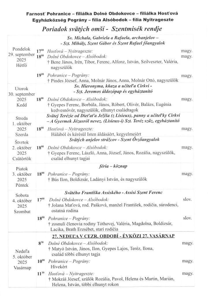 Oznamy - Poriadok svätých omší- Szentmisék rendje