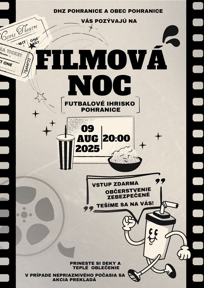 DHZ Pohranice v spolupráci s obcou Pohranice vás srdečne pozývajú na FILMOVÚ NOC, ktorá sa uskutoční 9. augusta 2025 o 20:00 na futbalovom ihrisku v Pohraniciach.