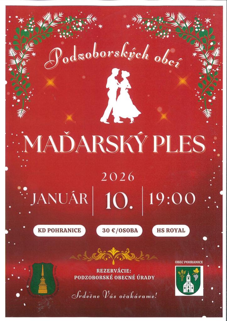 Pozývame Vás na MAĎARSKÝ PLES do Pohraníc 10. 1. 2026 Meghívjuk Önt Pogrányba a MAGYAR BÁLRA 2026. január 10-én