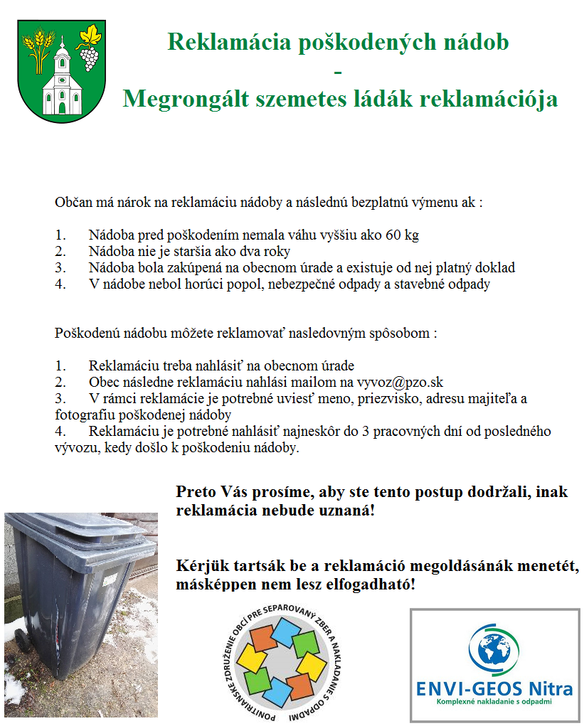 SK: Ako postupovať pri zistení, že Vám spoločnosť vyvážajúca odpad zničila nádobu? Odpoveď si prečítate na priloženom obrázku. HU: Milyen az eljárás, ha a szemetet exportáló cég megrongálta szemetládáját? További infó a képen látható.