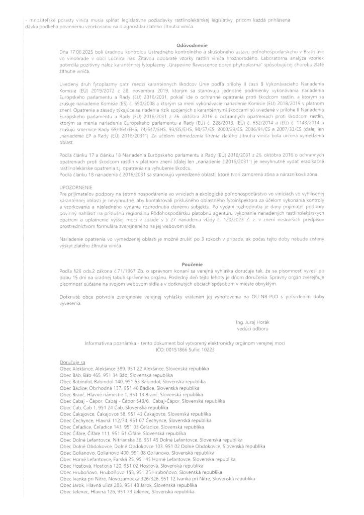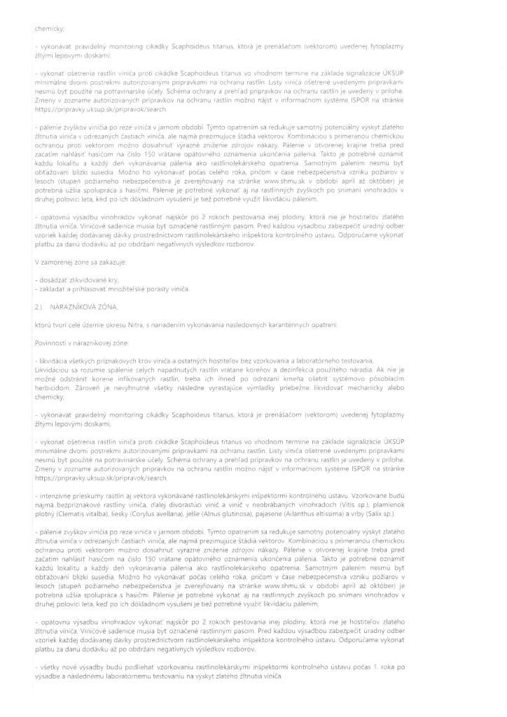 Vyhlásenie karantény - zistenie výskytu karanténnej fytoplazmy " Grapevine flavescence doreé phytoplasma" spôsobujúcej ochorenie - "zlaté žltnutie viniča".