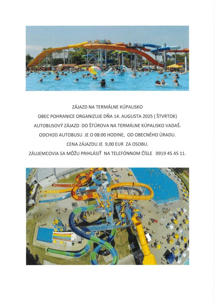 OBEC POHRANICE ORGANIZUJE DŇA 14. AUGUSTA 2025 ( ŠTVRTOK) AUTOBUSOVÝ ZÁJAZD DO ŠTÚROVA NA TERMÁLNE KÚPALISKO VADAŠ. ODCHOD AUTOBUSU JE O 08:00 HODINE, OD OBECNÉHO ÚRADU.